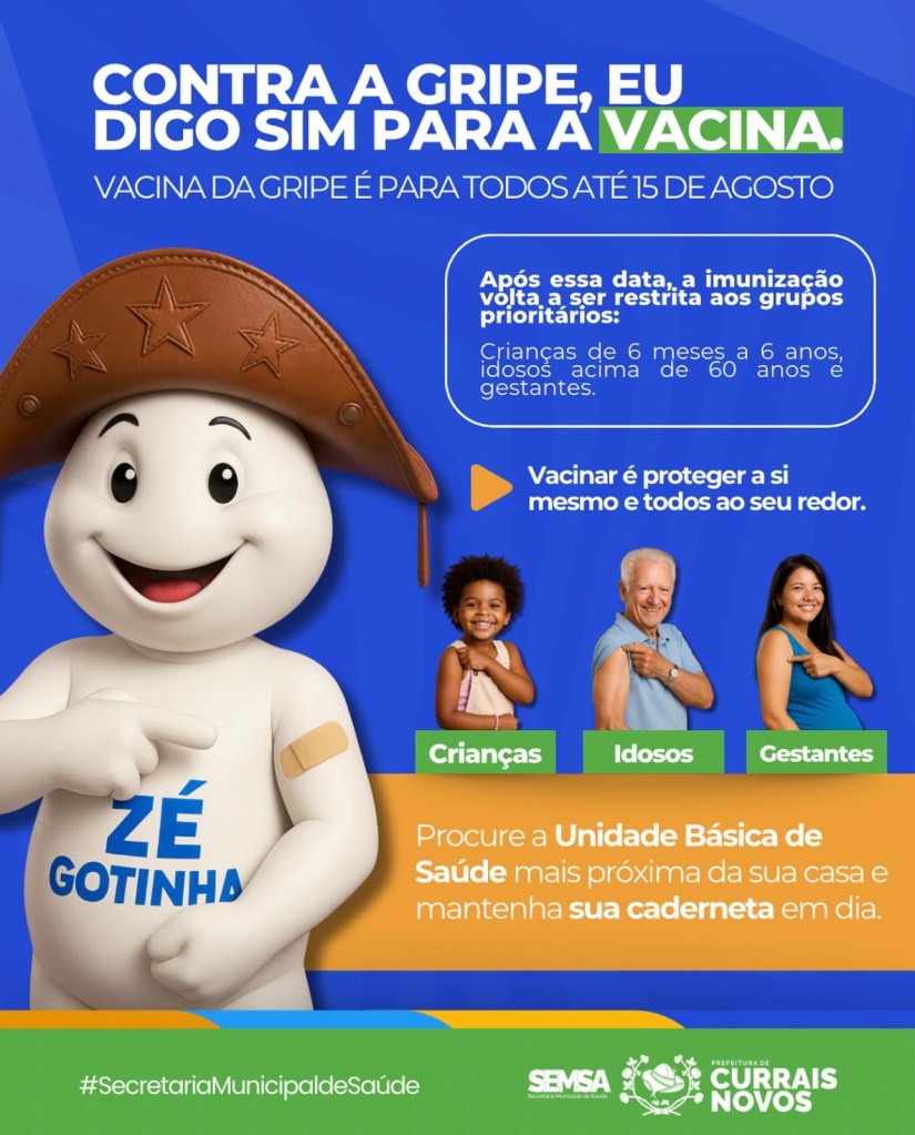 A vacinação contra a gripe está temporariamente liberada para toda a população do Rio Grande do Norte. A Secretaria de Estado da Saúde Pública (Sesap) anunciou que, até o dia 15 de agosto, qualquer pessoa, independentemente da faixa etária ou condição de saúde, pode se imunizar contra a gripe nos postos de vacinação do estado.