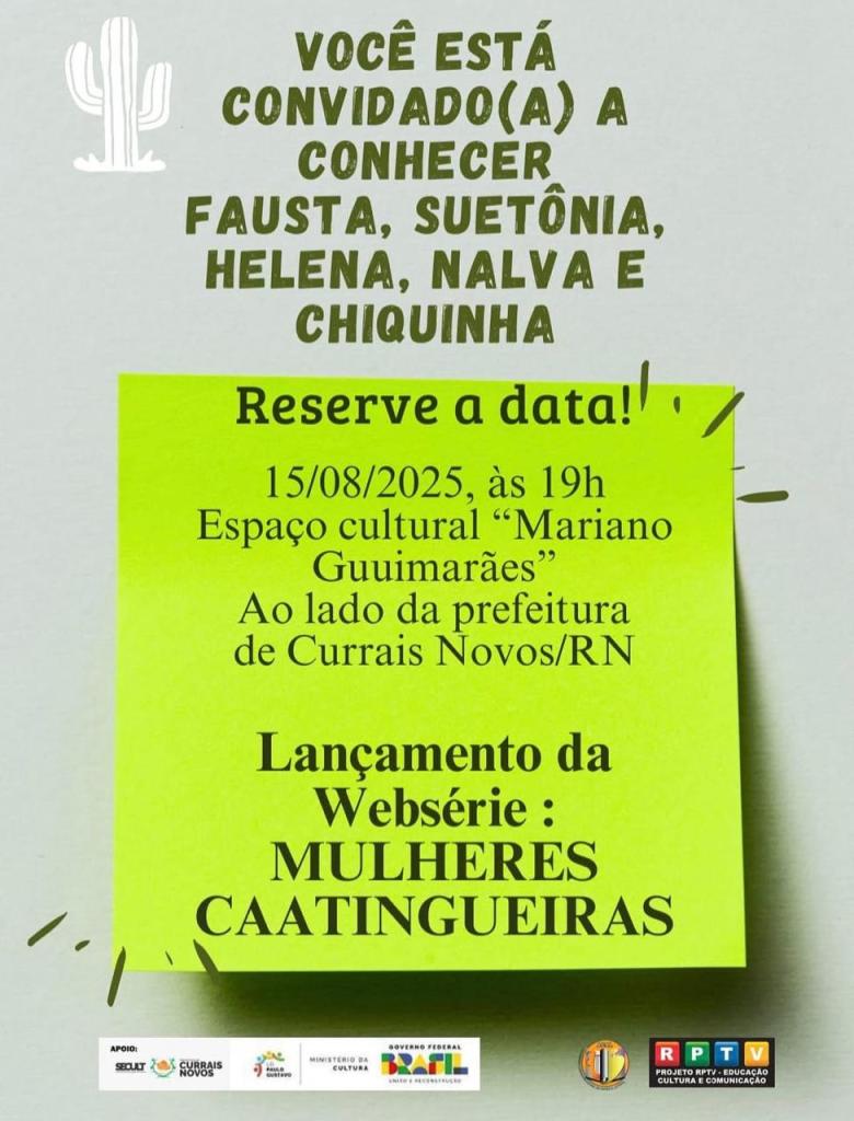 Nesta sexta-feira, 15 de agosto de 2025, Currais Novos será palco de um momento especial de memória, arte e valorização da mulher sertaneja. Às 19h, no Espaço Cultural Mariano Guimarães, acontece o lançamento da websérie “Mulheres Caatingueiras do Seridó”, com entrada gratuita e aberta ao público.