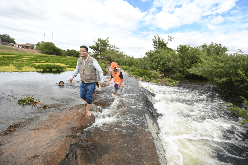 Descalços, integrantes do Ministério da Integração e Desenvolvimento Regional e do Governo do Estado caminharam em meio à correnteza que transbordava, em uma visita técnica para monitorar o volume transportado. Para os moradores, o momento virou celebração: pescarias improvisadas, mergulhos e sorrisos se misturaram ao sentimento de quem viu a vida renascer nas margens do Piranhas.