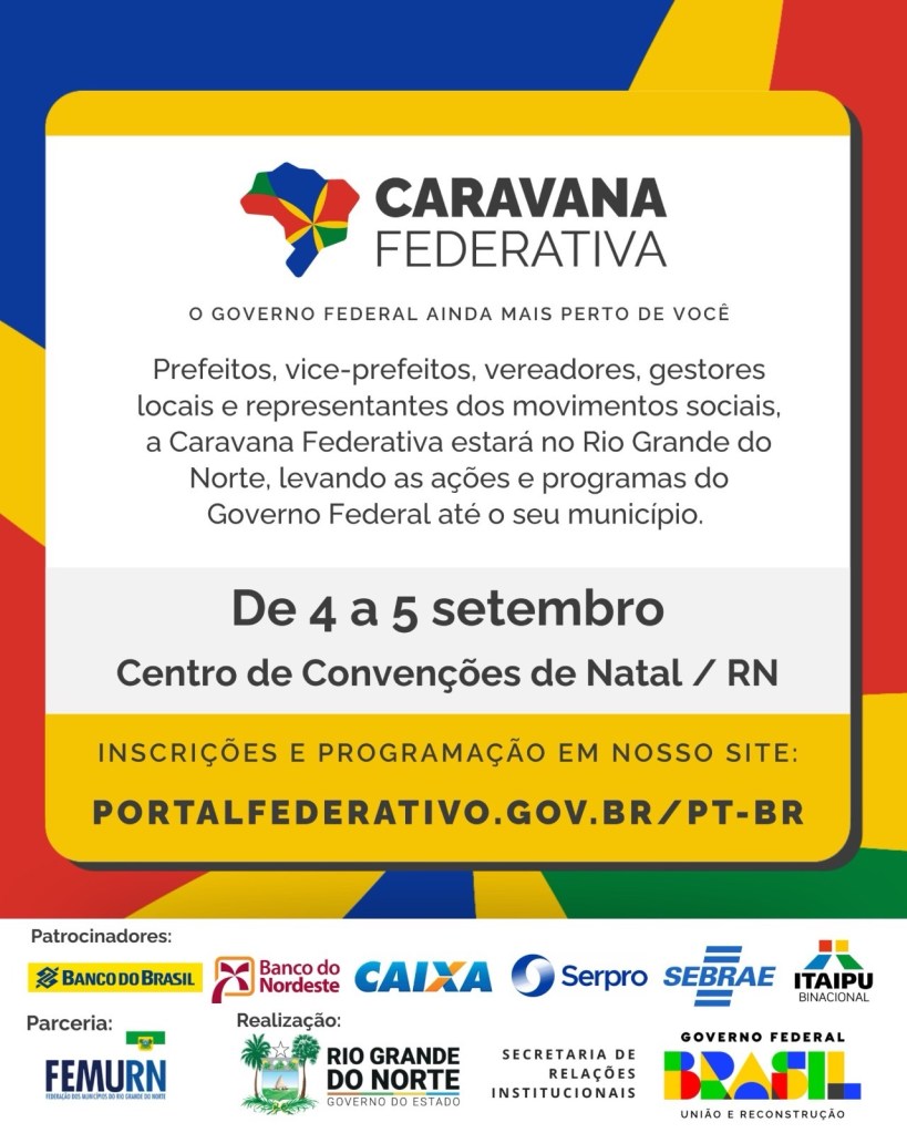 Natal será palco, nos dias 4 e 5 de setembro, da Caravana Federativa, iniciativa do Governo Federal que tem como objetivo aproximar a União dos municípios, facilitando o acesso a programas, convênios e serviços.