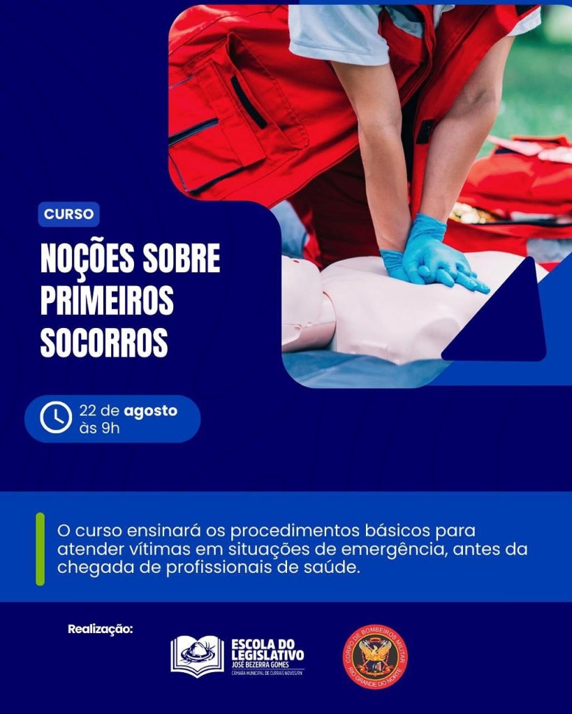 A Câmara Municipal de Currais Novos, por intermédio da Escola do Legislativo “José Bezerra Gomes”, realiza nesta sexta-feira (22), a partir das 9h, um curso de “Noções sobre Primeiros Socorros”. A iniciativa ocorre em parceria com o Corpo de Bombeiros e será aberto, também, para a comunidade.