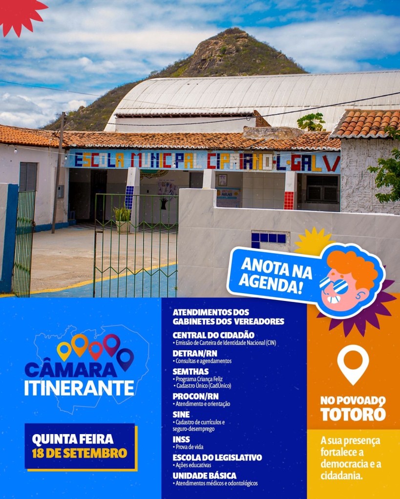 A Câmara Municipal de Currais Novos levará, no próximo dia 18 de setembro, a terceira edição do projeto Câmara Itinerante ao Povoado Totoró. A iniciativa, retomada em 2025, tem como objetivo aproximar o legislativo da população, promovendo um dia inteiro de serviços, atendimentos e atividades educativas.