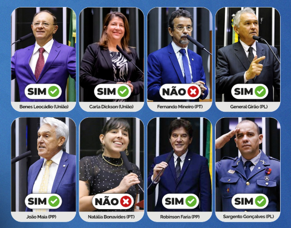 Pelo Rio Grande do Norte, votaram a favor, tanto da PEC da Blindagem, quanto do destaque que estabelece o privilégio do voto secreto para análise de processos criminais contra parlamentares os deputados federais: Benes Leocádio (União Brasil), Carla Dickson (União Brasil), General Girão (PL), Sargento Gonçalves (PL), João Maia (PP) e Robinson Faria (PP).