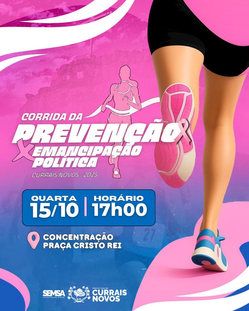 A Prefeitura de Currais Novos promove, nesta quarta-feira, dia 15 de outubro, a 1ª Corrida Outubro Rosa e Emancipação Política do município, unindo promoção à saúde, incentivo ao esporte e celebração cívica em um só evento. A concentração acontece em frente à sede da Prefeitura, com largada marcada para às 17h.