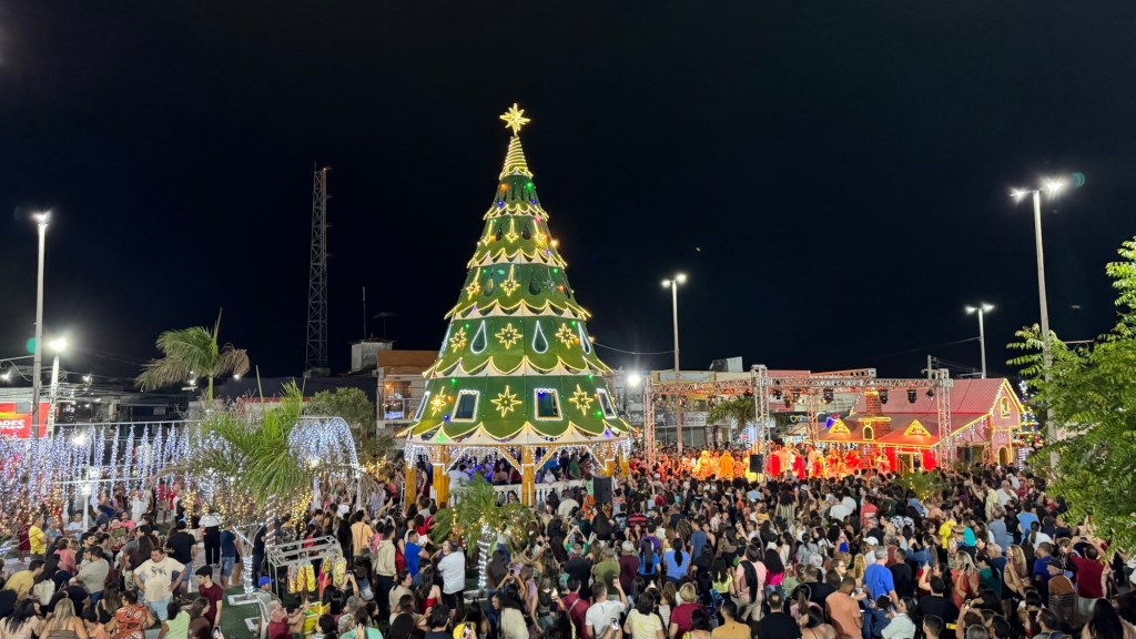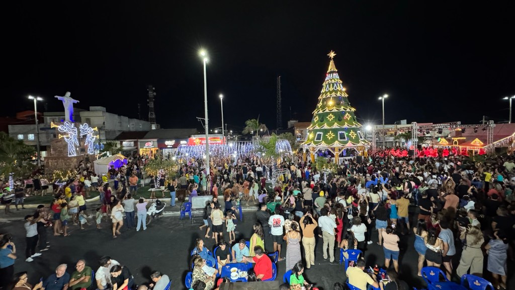 A festa aconteceu na Praça Cristo Rei, no Centro da cidade, com uma programação que contou com espetáculo teatral, música, contagem regressiva e a tão aguardada chegada do Papai Noel à cidade.