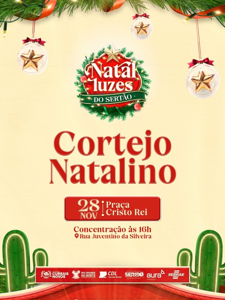 A Prefeitura de Currais Novos convida toda a comunidade para participar, acompanhar o trajeto e ajudar a fazer do Cortejo Natalino do ‘Natal Luzes do Sertão’ mais um momento inesquecível na cidade.