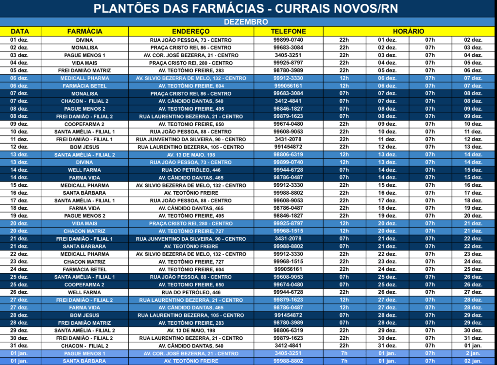 Confira quais são as farmácias de plantão de Currais Novos durante o mês de dezembro de 2025.