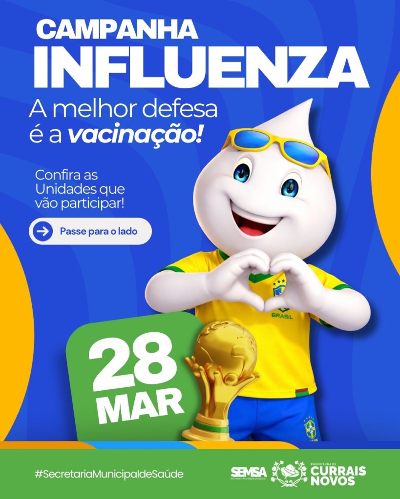 A Prefeitura de Currais Novos, por meio da Secretaria Municipal de Saúde (SEMSA), inicia no próximo dia 28 de março a Campanha de Vacinação contra a Influenza, com o objetivo de proteger a população contra o vírus da gripe e reduzir complicações, internações e óbitos.
